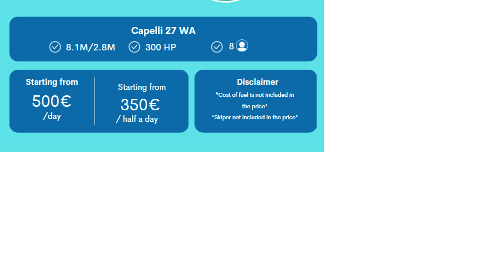 The Capelli 27 WA is a high-performance cabin cruiser that offers a perfect blend of style, comfort, and functionality. Measuring 8.4 meters in length and 2.95 meters in beam, this boat is designed to provide a comfortable and stable ride even in choppy waters.