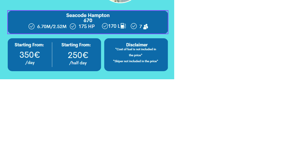 Speedboat SEACODE 670 HAMPTON - perfect for exploring the magnificent Kvarner and experiencing the Adriatic Sea! Spacious and comfortable with its total length of 6.7 meters including the cabin, this vessel can accommodate up to 7 people on board, while our recommended capacity for the best pleasure is 5 people. The four-stroke Yamaha 175 hp outboard offers more than enough power. Full teak, spacious bow and stern deck, shower, refrigerator, awning, ladder, GPS, fish finder, electric bow and winch and much more