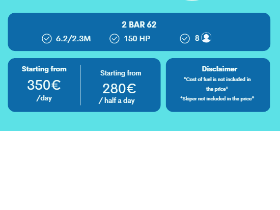 The exterior of the 2 BAR 62 features a sleek and modern design, with a deep-V hull and a distinctive sundeck. The boat is equipped with a spacious structure that can comfortably accommodate up to 8 passengers, making it ideal for day trips or entertaining guests.